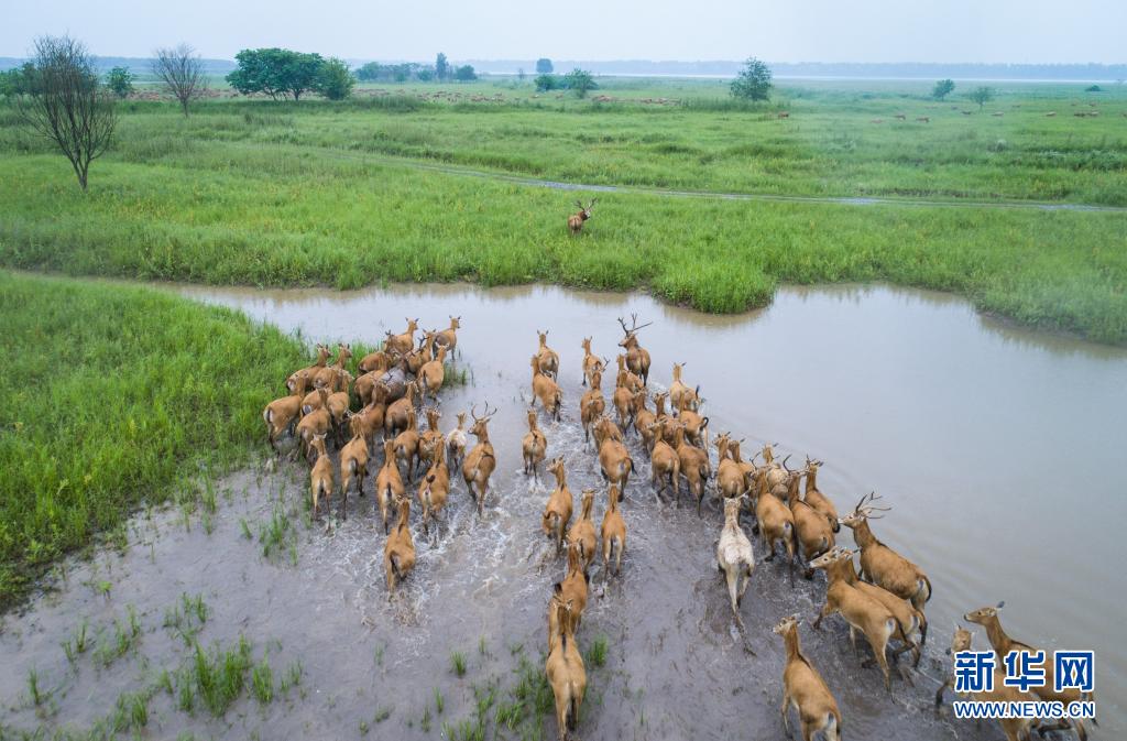 5月17日,一群麋鹿在石首麋鹿國(guó)家級(jí)自然保護(hù)區(qū)內(nèi)活動(dòng)(無(wú)人機(jī)照片)。新華社記者 肖藝九 攝