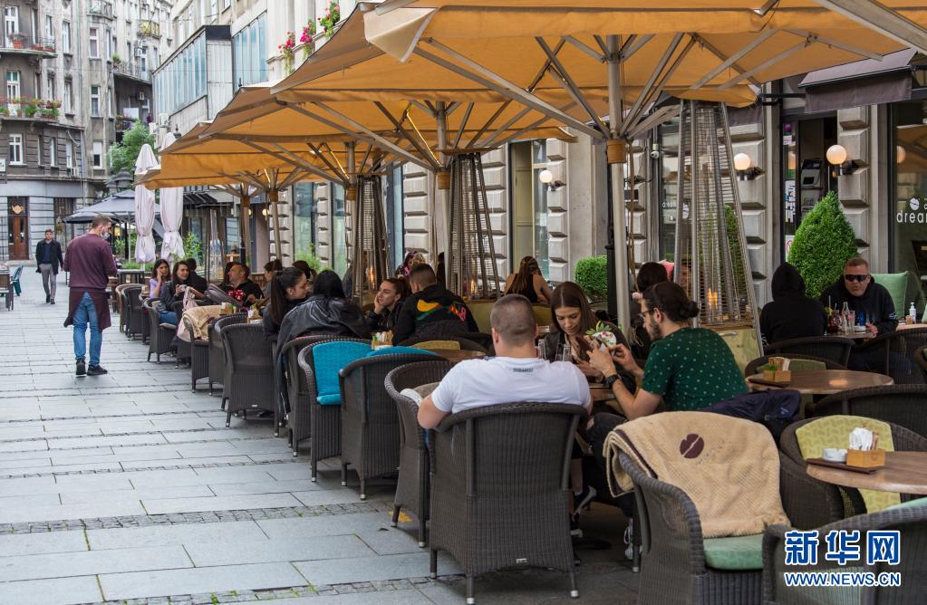 5月31日,在塞爾維亞貝爾格萊德,人們?cè)谝患也蛷d的室外餐區(qū)用餐。