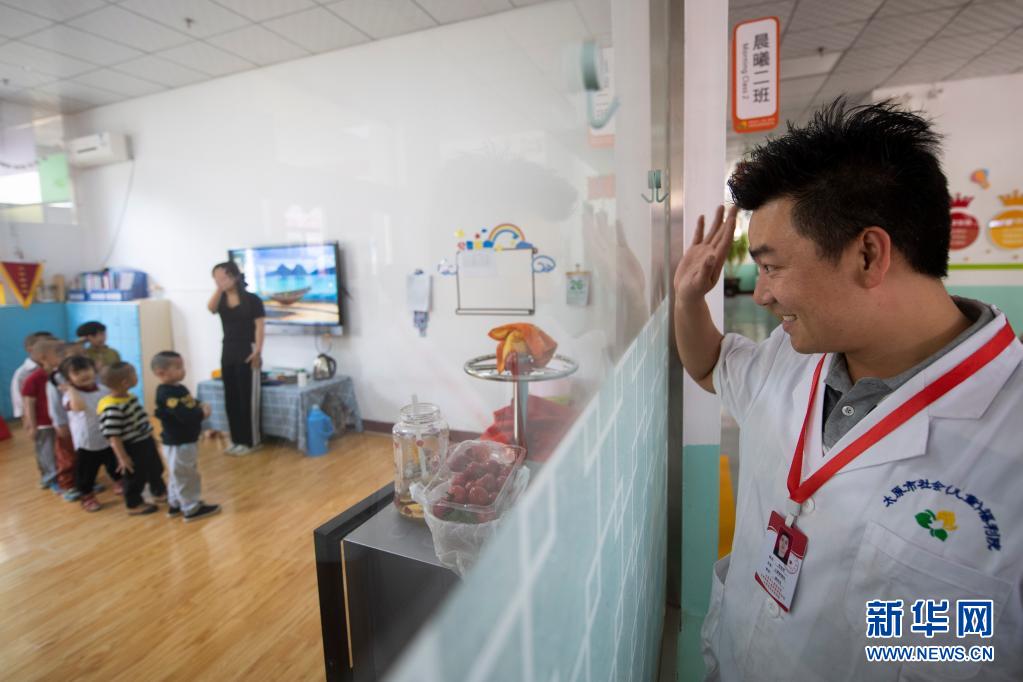 在太原市社會(兒童)福利院內(nèi)的特教學(xué)校,黨龍祥看著正在為六一準(zhǔn)備節(jié)目的孩子們(5月26日攝)。新華社記者 楊晨光 攝