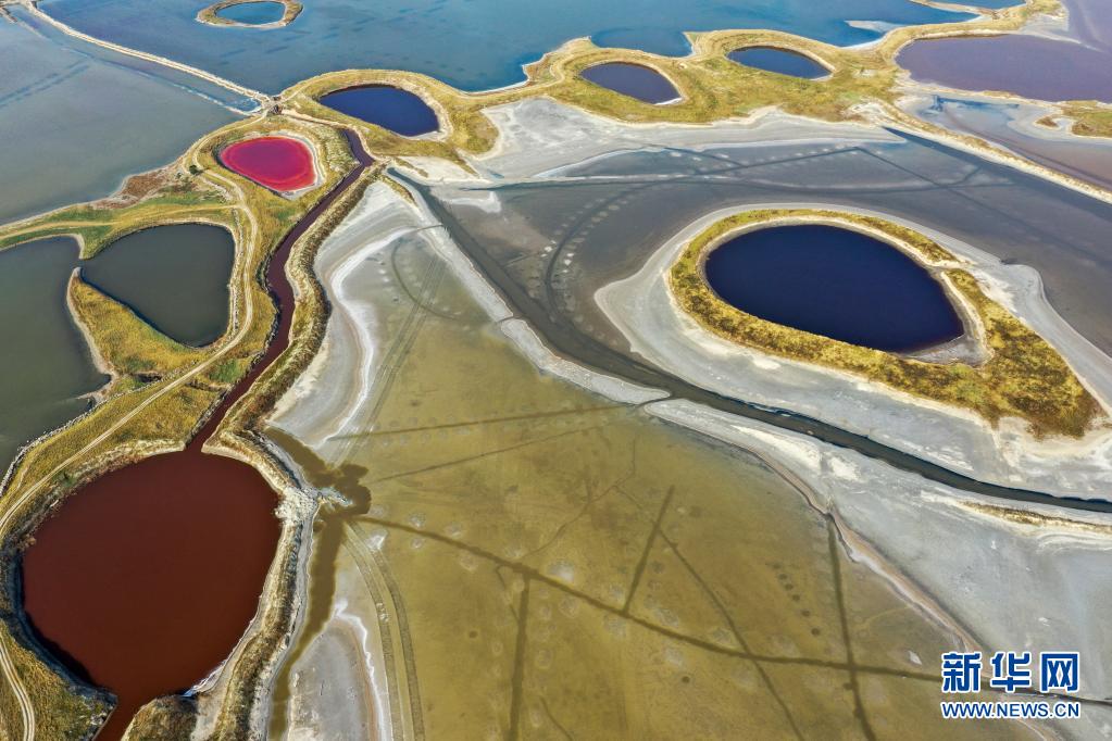 近日,隨著氣溫不斷升高,山西運(yùn)城鹽湖呈現(xiàn)五彩斑斕的景象。