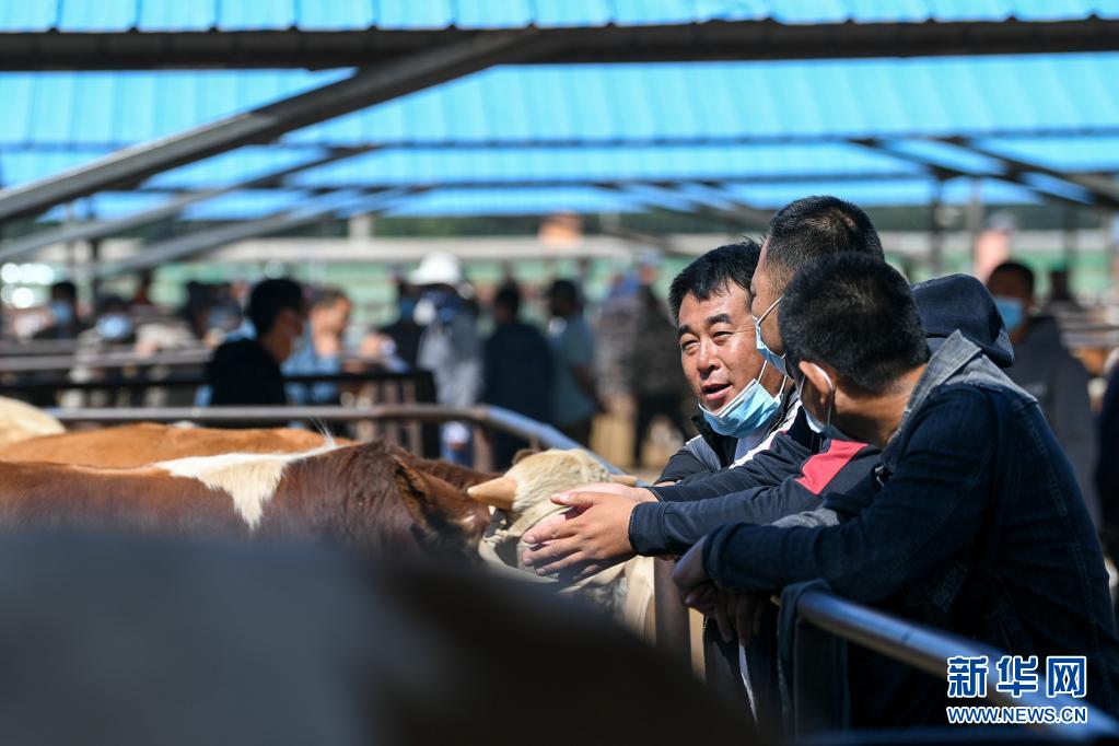6月1日,交易者在開魯牛市交易攤位看牛詢價。