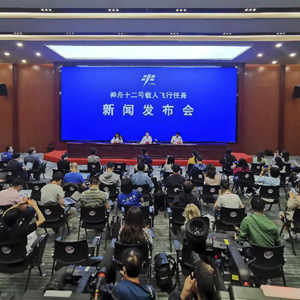 6月16日,神舟十二號載人飛行任務新聞發(fā)布會在酒泉衛(wèi)星發(fā)射中心召開(手機拍攝)。