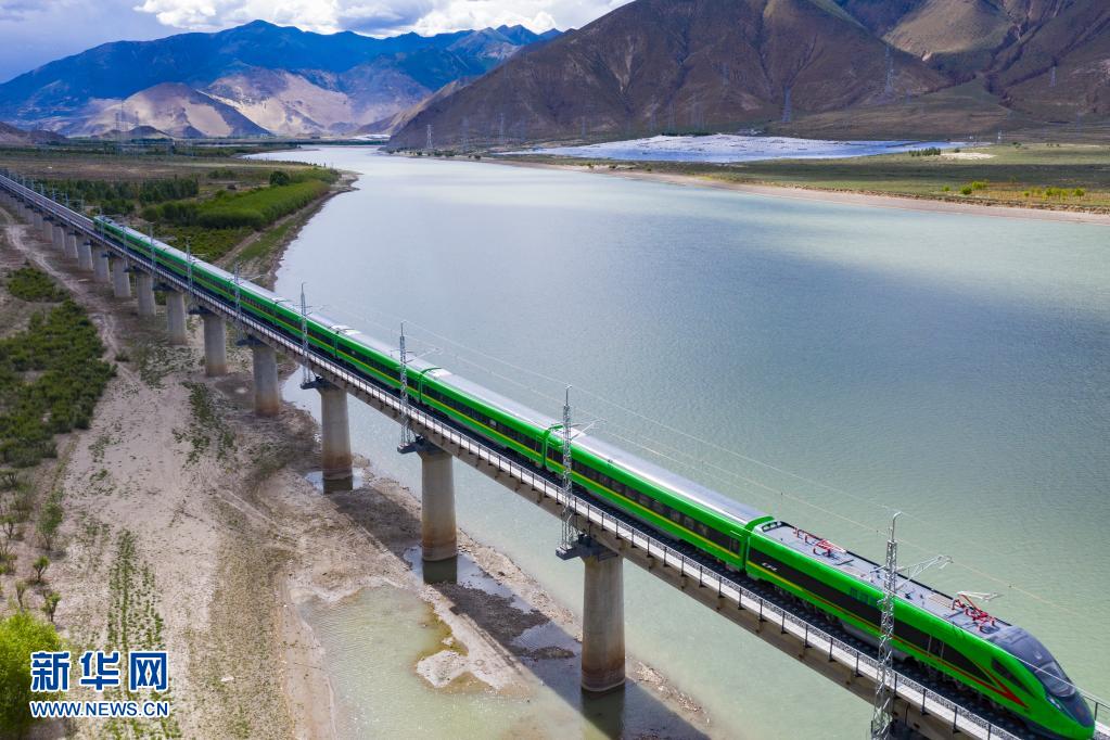 試運(yùn)行的復(fù)興號列車行駛在雅魯藏布江上(6月16日攝,無人機(jī)照片)。