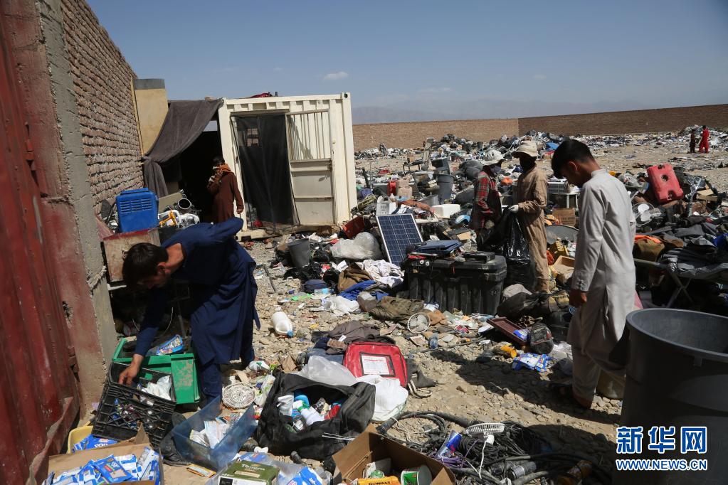 7月3日,在阿富汗帕爾萬省的巴格拉姆空軍基地附近,當(dāng)?shù)鼐用裨诿儡娺z留下的物品中回收廢舊物。
