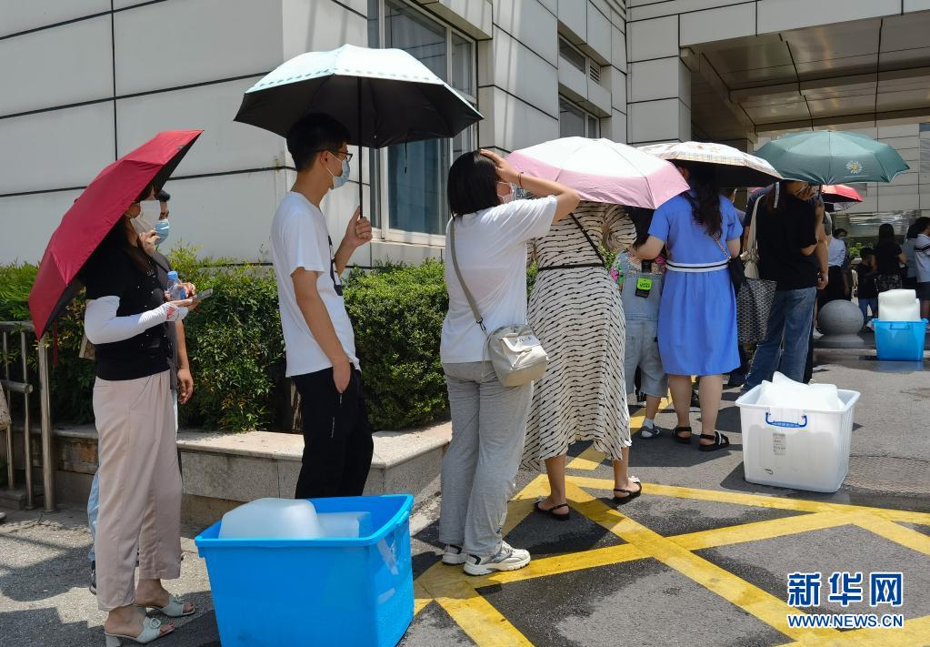 江蘇省南京市于7月21日開始對全市常住人口、外來人員開展全員核酸檢測。目前正值盛夏,氣溫較高,在南京市第一醫(yī)院河西院區(qū)核酸檢測點,工作人員專門為排隊等候的市民準備了冰塊降溫。
