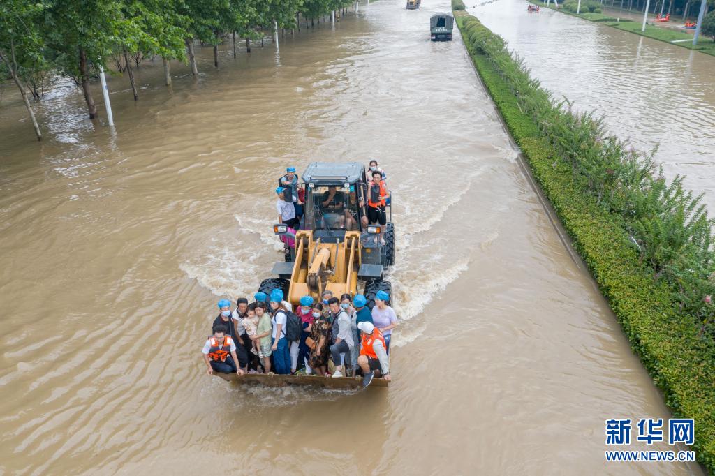 7月22日,在阜外華中心血管病醫(yī)院附近的錦繡路與鄭開大道交叉口,救援人員利用鏟車轉(zhuǎn)移人員(無人機(jī)照片)。