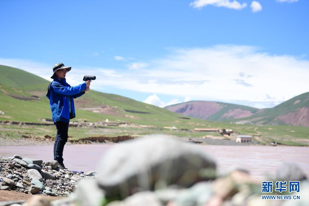 2021年長(zhǎng)江源綜合科考的科考隊(duì)員陳鵬在通天河流域觀測(cè)河流流速(7月24日攝)。