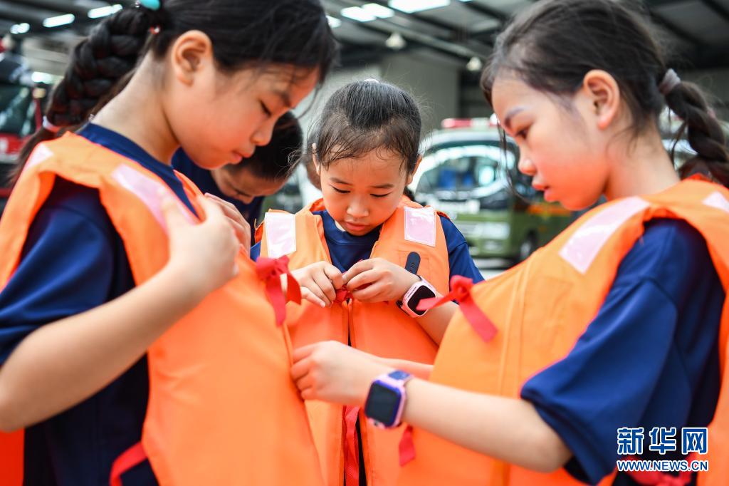 在四川省森林消防總隊(duì)特勤大隊(duì),孩子們在練習(xí)穿救生衣(7月27日攝)。