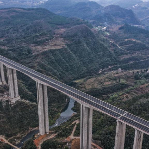 施工车辆行驶在贵平高速马场河特大桥上(12月23日摄,无人机照片)。