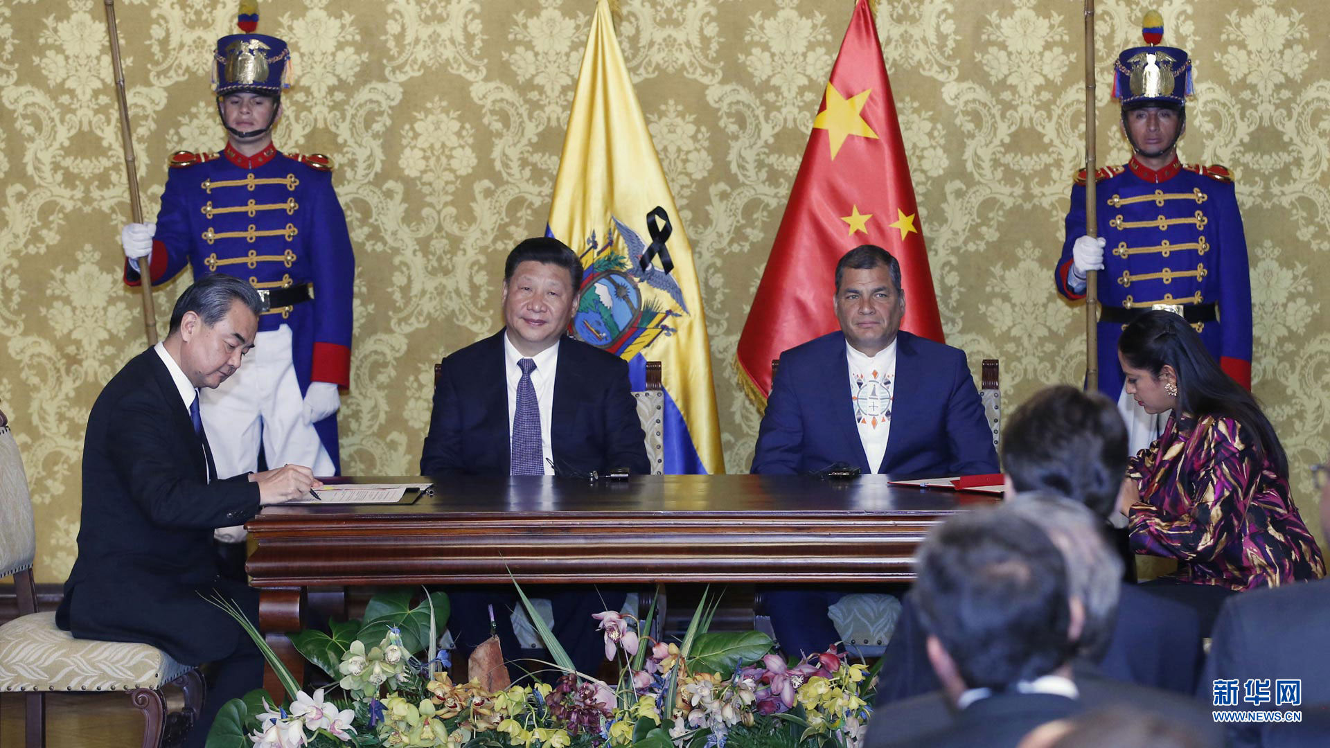 當(dāng)?shù)貢r間11月17日,國家主席習(xí)近平在基多同厄瓜多爾總統(tǒng)科雷亞舉行會談。這是會談后,兩國元首見證雙邊合作文件的簽署。 新華社記者 鞠鵬攝2016-11-18