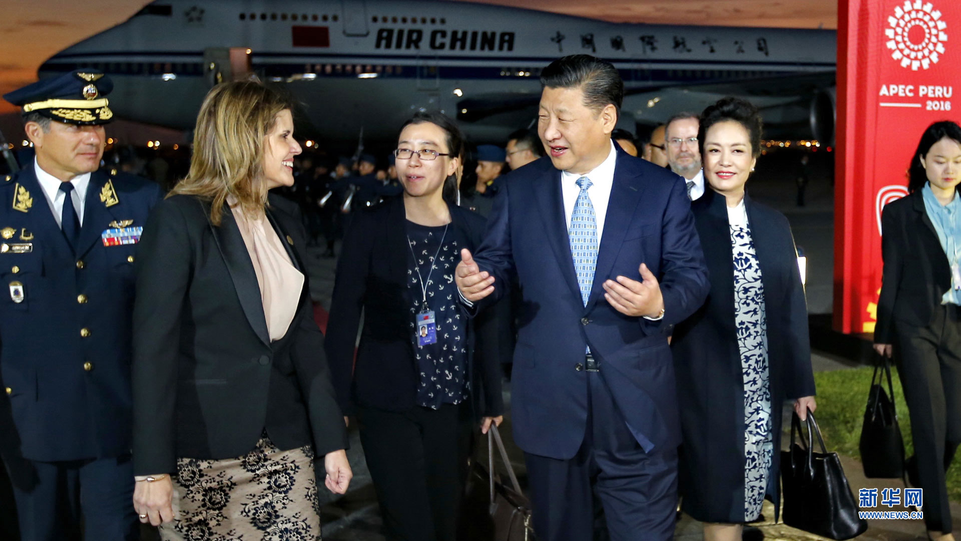 當(dāng)?shù)貢r間11月18日,國家主席習(xí)近平抵達(dá)利馬,出席亞太經(jīng)合組織第二十四次領(lǐng)導(dǎo)人非正式會議并對秘魯共和國進(jìn)行國事訪問。習(xí)近平和夫人彭麗媛受到秘魯副總統(tǒng)阿勞斯等熱情迎接。新華社記者 鞠鵬 攝2016-11-20
