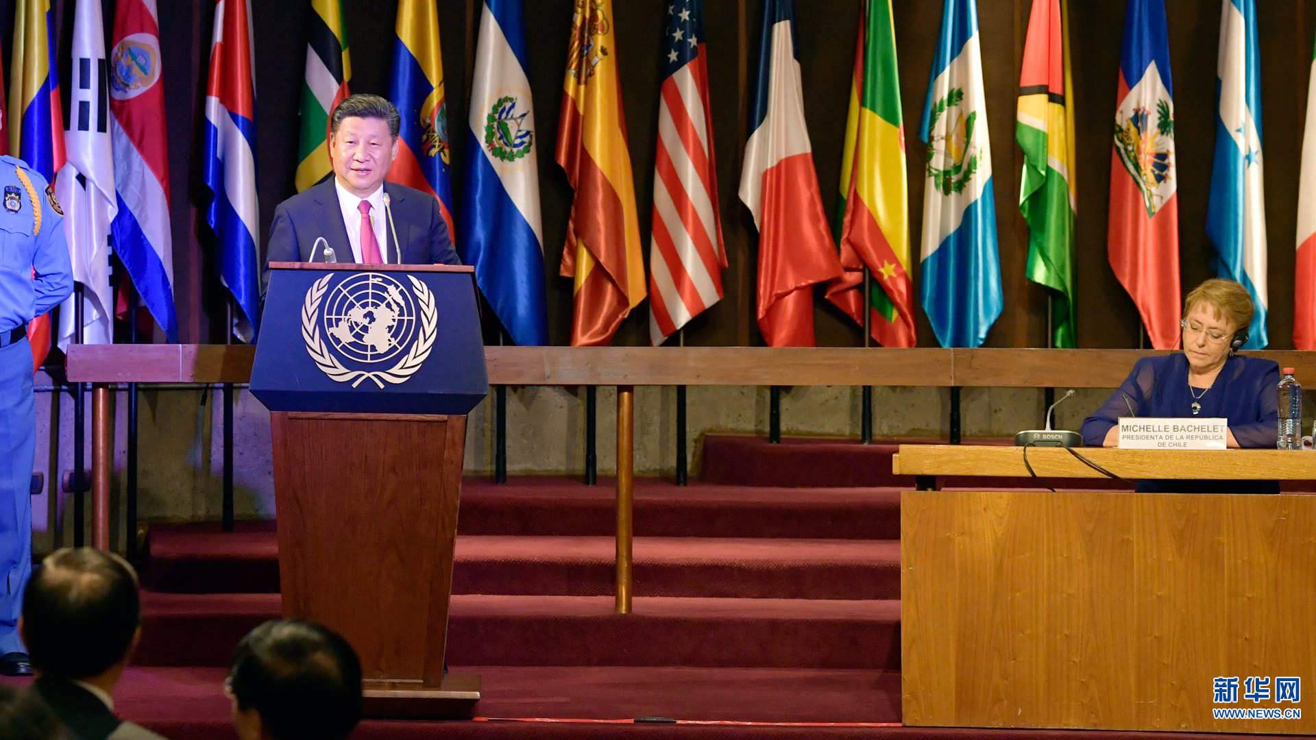 11月22日,國家主席習(xí)近平在圣地亞哥聯(lián)合國拉丁美洲和加勒比經(jīng)濟(jì)委員會總部出席中拉媒體領(lǐng)袖峰會開幕式。智利總統(tǒng)巴切萊特陪同出席。在熱烈的掌聲中,習(xí)近平發(fā)表題為《開創(chuàng)中拉媒體合作新局面》的致辭。新華社記者 王曄 攝2016-11-23