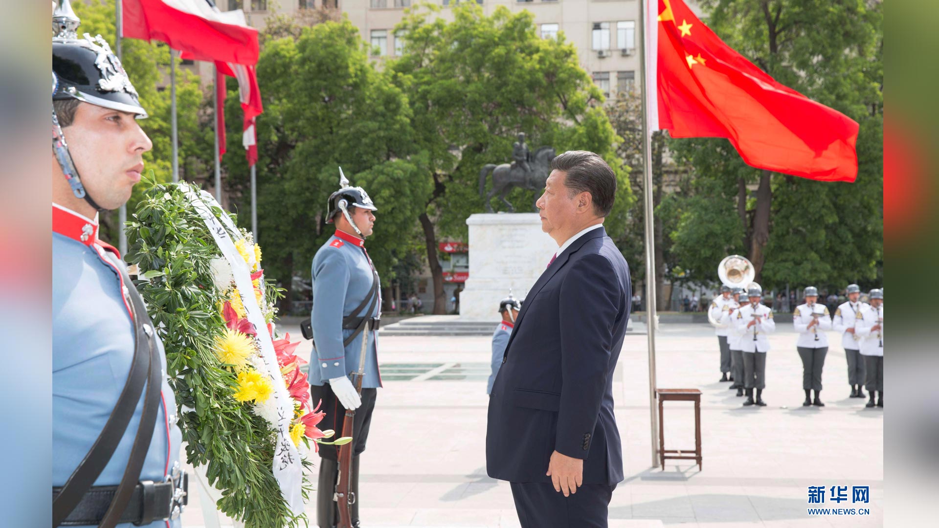 11月22日,國家主席習(xí)近平在圣地亞哥向智利解放者奧希金斯紀(jì)念碑敬獻(xiàn)花圈。 新華社記者 黃敬文 攝2016-11-23