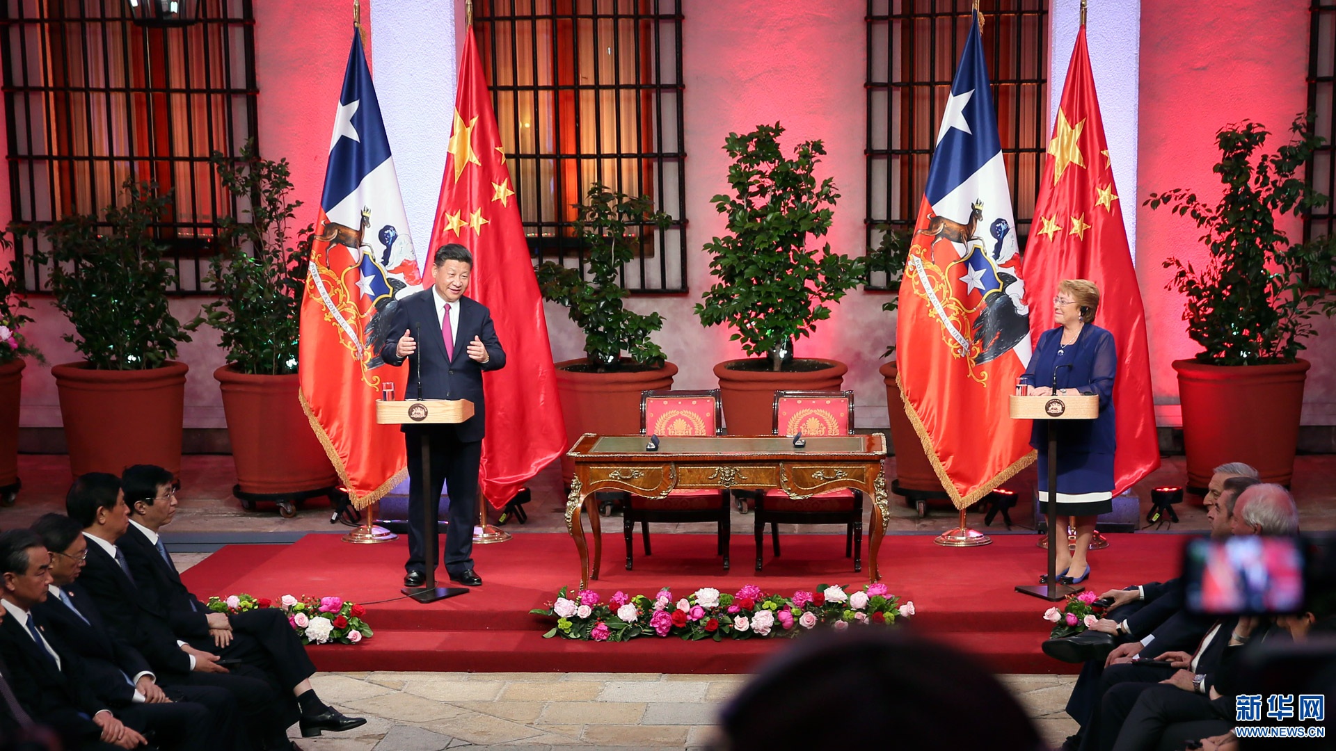 11月22日,國家主席習(xí)近平在圣地亞哥同智利總統(tǒng)巴切萊特舉行會談。這是會談后,兩國元首共同會見記者。 新華社記者 蘭紅光 攝2016-11-23
