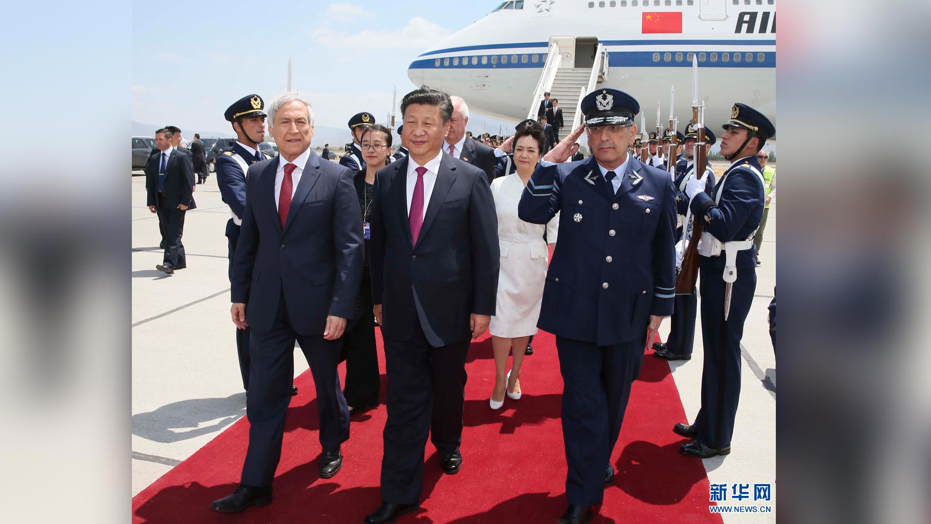 11月22日,國家主席習(xí)近平抵達(dá)圣地亞哥,對智利共和國進(jìn)行國事訪問。智利外長穆尼奧斯等在機(jī)場迎接習(xí)近平和夫人彭麗媛。 新華社記者蘭紅光 攝2016-11-23