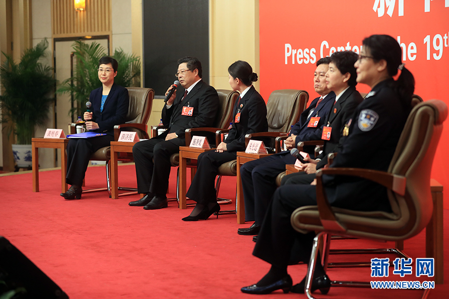 ??? 10月19日,十九大新聞中心舉辦集體采訪,邀請政法戰(zhàn)線代表談全面推進依法治國。圖為采訪現(xiàn)場。新華網(wǎng) 郝廣鵬攝
