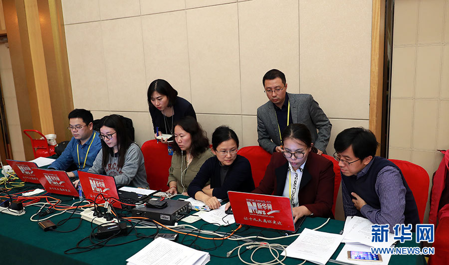 ??? 10月20日,十九大新聞中心舉辦集體采訪活動,主題為“實(shí)施創(chuàng)新驅(qū)動發(fā)展戰(zhàn)略”。圖為新華網(wǎng)在現(xiàn)場直播。新華網(wǎng) 郝廣鵬攝