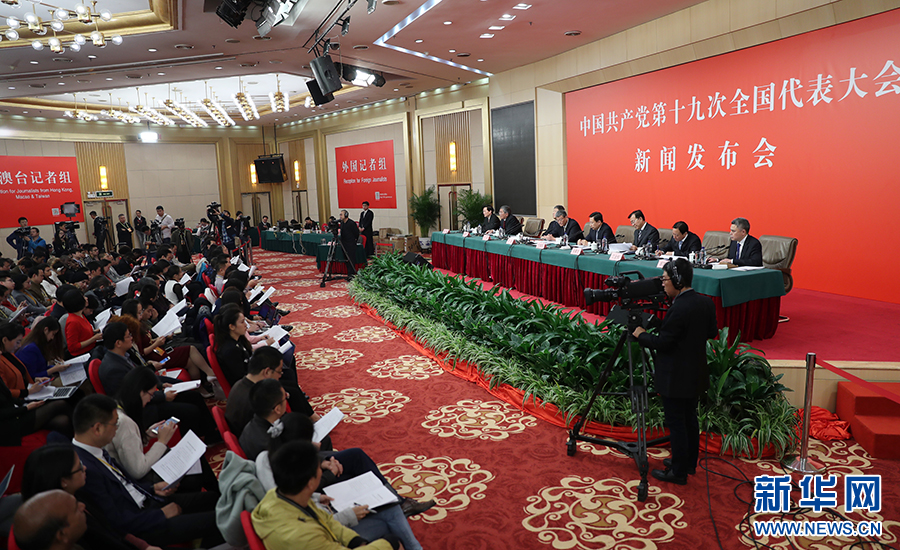 10月26日上午10:00,中國(guó)共產(chǎn)黨第十九次全國(guó)代表大會(huì)新聞發(fā)言人在梅地亞賓館二層新聞發(fā)布廳召開(kāi)專題新聞發(fā)布會(huì),請(qǐng)有關(guān)方面負(fù)責(zé)人解讀十九大報(bào)告,并回答記者關(guān)心的問(wèn)題。圖為新聞發(fā)布會(huì)現(xiàn)場(chǎng)。新華網(wǎng) 翟子赫 攝