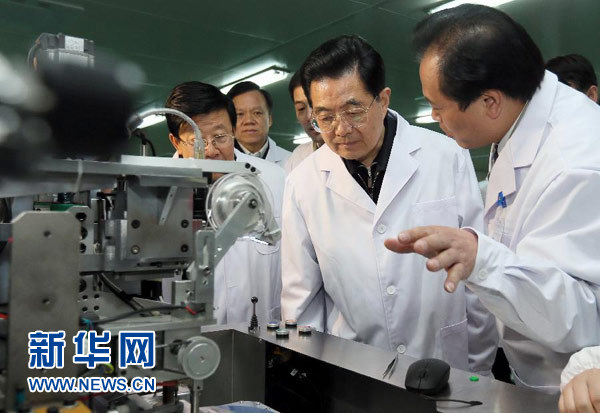 ????12月1日至6日,國家主席胡錦濤在貴州考察工作。這是胡錦濤在裕能科爾微電子股份有限公司深入了解企業(yè)技術創(chuàng)新情況。 新華社記者 鞠鵬 攝