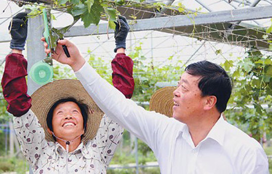 武繼軍(右)在查看村里的農(nóng)業(yè)科技示范園。
