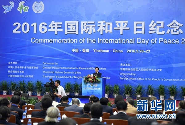 新華社銀川9月21日電(記者趙倩)2016年國際和平日紀(jì)念活動(dòng)21日在銀川開幕,國家副主席李源潮出席并致辭,全國政協(xié)副主席馬飚出席。
