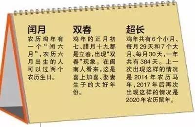 一些細(xì)心的網(wǎng)友發(fā)現(xiàn),今年是農(nóng)歷丁酉雞年,雞年有兩個立春日,出現(xiàn)“一年兩頭春”歷法現(xiàn)象。所謂“一年兩頭春”也稱“雙春年”,是指在農(nóng)歷的一年中有兩個立春之日。具體到農(nóng)歷雞年來說,2017年1月28日開始進(jìn)入農(nóng)歷雞年,而直到2018年的2月16日才會迎來下一個農(nóng)歷新年,所以農(nóng)歷丁酉雞年就包含了兩個立春日,即雞年的正月初七立春(2017年2月3日)和同年臘月十九(2018年2月4日)再次立春。