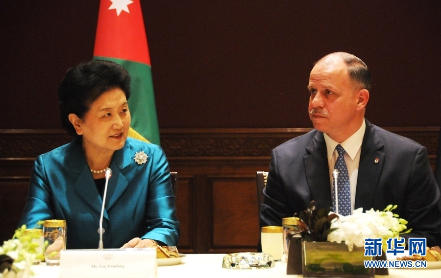 4月20日,在約旦首都安曼,約旦代國(guó)王費(fèi)薩爾(右)會(huì)見(jiàn)中國(guó)國(guó)務(wù)院副總理劉延?xùn)|。新華社記者林曉蔚攝