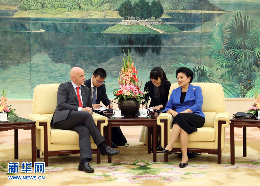 6月14日,國(guó)務(wù)院副總理劉延?xùn)|在北京人民大會(huì)堂會(huì)見(jiàn)來(lái)華訪(fǎng)問(wèn)的國(guó)際足聯(lián)主席因凡蒂諾。 新華社記者劉衛(wèi)兵攝