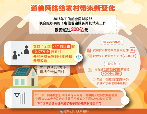 近年來(lái),我國(guó)加大對(duì)中西部地區(qū)和農(nóng)村貧困地區(qū)移動(dòng)互聯(lián)網(wǎng)基礎(chǔ)設(shè)施建設(shè)的投資力度,加快推進(jìn)貧困地區(qū)網(wǎng)絡(luò)全覆蓋,著力降低貧困群眾享受信息生活門(mén)檻。截至2016年底,我國(guó)貧困村寬帶覆蓋率超過(guò)80%,農(nóng)村光纖寬帶用戶超過(guò)7400萬(wàn)戶。今年將有望實(shí)現(xiàn)寬帶網(wǎng)絡(luò)再覆蓋8000個(gè)貧困村。同時(shí),我國(guó)互聯(lián)網(wǎng)服務(wù)的質(zhì)量和水平也在不斷提升。