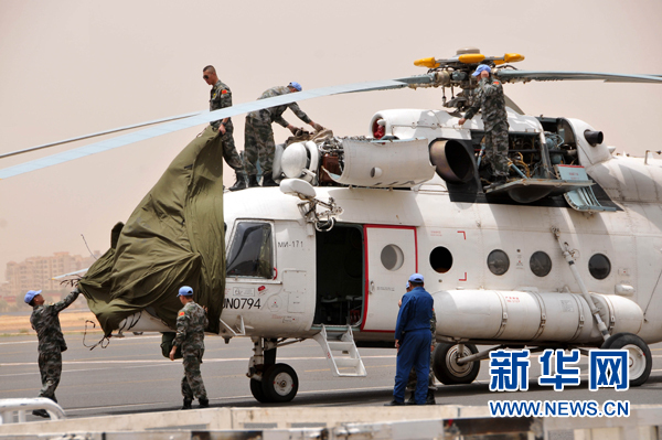 ?。吩拢常比眨袊?guó)首批維和直升機(jī)分隊(duì)在蘇丹喀土穆國(guó)際機(jī)場(chǎng)成功首飛。
