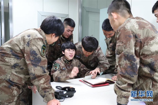 11月2日,黨的十九大代表、吉林省軍區(qū)數(shù)據(jù)信息室助理工程師張燕兵(中)來到吉林省軍區(qū)綜合訓(xùn)練隊(duì)宣講十九大精神。新華社發(fā)(屈雷宇攝)