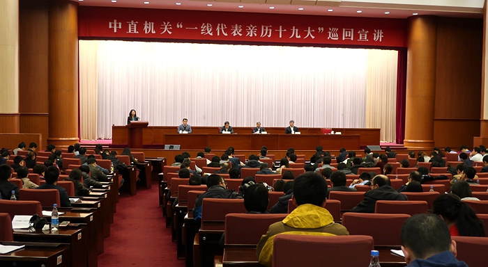 11月14日,中直機(jī)關(guān)“一線代表親歷十九大”巡回宣講首場報告會在北京全國政協(xié)機(jī)關(guān)會議樓舉行。新華網(wǎng) 聶晨靜 攝