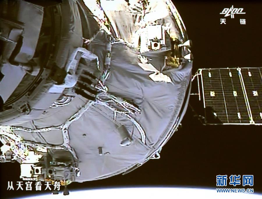 4月22日,北京航天飛行控制中心大廳大屏幕顯示天舟一號與天宮二號自動交會對接畫面。這是天舟一號與天宮二號進(jìn)行的首次自動交會對接,也是我國自主研制的貨運(yùn)飛船與空間實驗室的首次交會對接。(新華社發(fā)王泗江 攝)
