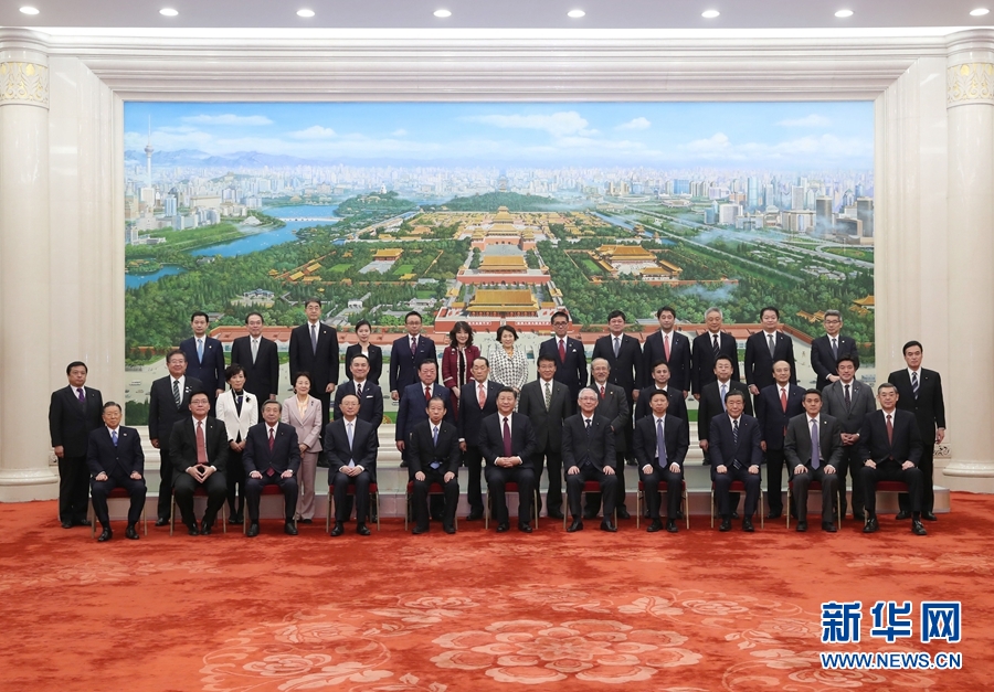 會(huì)見后,習(xí)近平與參加中日?qǐng)?zhí)政黨交流機(jī)制第七次會(huì)議部分日方代表合影留念。