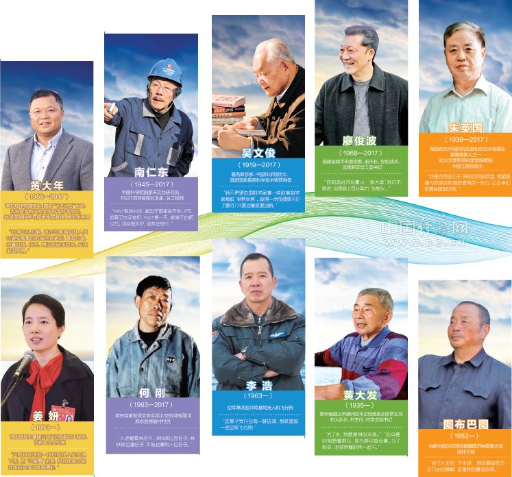 回首2017年,我國各行各業(yè)涌現出一批有理想情懷、有人格魅力、有卓越言行的時代先鋒。這當中,有先后3次將自家挖出的國家級文物上交故宮博物院的普通農民,也有帶領當地群眾用30年的時間在懸崖峭壁上鑿出近10公里長“生命渠”的老支書,還有為了中國天文事業(yè)拄著竹竿、翻山越嶺踏遍貴州大山所有洼地為射電望遠鏡選址的“天眼之父”。