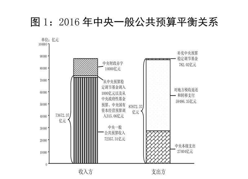 中央一般公共預(yù)算收入72357.31億元,為調(diào)整預(yù)算的100%,比2015年同口徑增長1.2%。加上從中央預(yù)算穩(wěn)定調(diào)節(jié)基金調(diào)入1000億元,從中央政府性基金預(yù)算、中央國有資本經(jīng)營預(yù)算調(diào)入315.06億元,收入總量為73672.37億元。中央一般公共預(yù)算支出86890.35億元(其中,中央本級支出27404億元,中央對地方稅收返還和轉(zhuǎn)移支付59486.35億元),完成調(diào)整預(yù)算的99.1%,增長4.5%。加上補(bǔ)充中央預(yù)算穩(wěn)定調(diào)節(jié)基金782.02億元,支出總量為87672.37億元。收支總量相抵,中央財(cái)政赤字14000億元,與預(yù)算持平。2016年中央預(yù)備費(fèi)預(yù)算500億元,實(shí)際支出146.1億元,剩余353.9億元全部轉(zhuǎn)入中央預(yù)算穩(wěn)定調(diào)節(jié)基金。2016年末,中央財(cái)政國債余額120066.75億元,控制在年度預(yù)算限額125908.35億元以內(nèi);中央預(yù)算穩(wěn)定調(diào)節(jié)基金余額2678.06億元(含通過收回中央財(cái)政結(jié)轉(zhuǎn)資金補(bǔ)充1501.83億元)。
