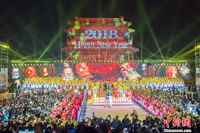 2018年1月1日,2018北京新年倒計時活動暨北京冰雪文化旅游節(jié)開幕式在北京永定門南廣場舉行。多國駐華使節(jié)、首都各行業(yè)的“北京榜樣”、北京旅游行業(yè)代表、中外游客、學生和市民代表共一千余人共同迎接新年的到來。中新網記者 富宇 攝