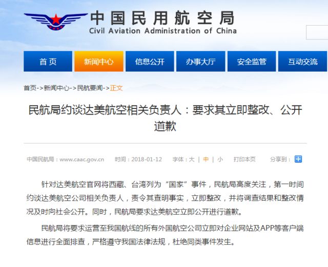 針對(duì)達(dá)美航空官網(wǎng)將西藏、臺(tái)灣列為“國家”事件,民航局高度關(guān)注,第一時(shí)間約談達(dá)美航空公司相關(guān)負(fù)責(zé)人,責(zé)令其查明事實(shí),立即整改,并將調(diào)查結(jié)果和整改情況及時(shí)向社會(huì)公開。同時(shí),民航局要求達(dá)美航空立即公開進(jìn)行道歉。