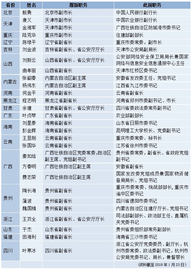 新華網(wǎng)北京1月24日電(記者陳淑君 李志強(qiáng))2018年省級(jí)地方兩會(huì)大幕開啟,多地黨政領(lǐng)導(dǎo)班子近日迎來密集調(diào)整。1月19日到23日,重慶、廣西、甘肅等地省級(jí)黨委常委班子成員陸續(xù)調(diào)整,北京、天津、內(nèi)蒙古、遼寧等十九省區(qū)市28位省級(jí)政府副職履新。