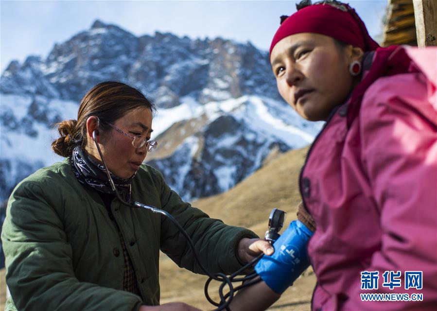巡診隊(duì)里唯一的女醫(yī)生張紅英(左)在為牧民檢查身體(2017年12月18日攝)。新華社記者 江文耀 攝