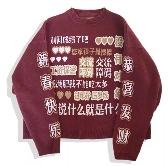 所謂鎧甲,其實(shí)是一件自帶吐槽氣質(zhì)的衛(wèi)衣,兩條袖子上分別印著“新春快樂(lè)”“恭喜發(fā)財(cái)”,仿佛大門(mén)兩側(cè)貼著喜慶的春聯(lián)。然而“推門(mén)”進(jìn)去,衛(wèi)衣正面沖出一大片冷冰冰的“彈幕”:“別問(wèn)成績(jī)了吧”“工資保密”“交流障礙”“沒(méi)有對(duì)象”“您家孩子最棒棒”……