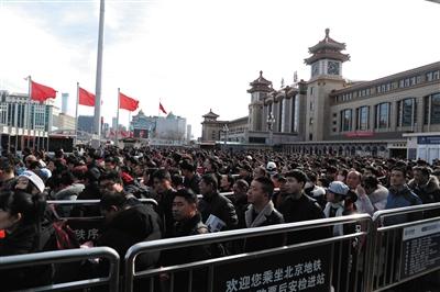 昨天上午10點半,地鐵北京站D口外立起了多條鐵柵欄,將長達百米的等待隊伍分成了四列。記者從中國鐵路總公司獲悉,2月20日,鐵路春運迎來返程客流高峰,全國鐵路預(yù)計發(fā)送旅客1060萬人次,同比增長8.3%。