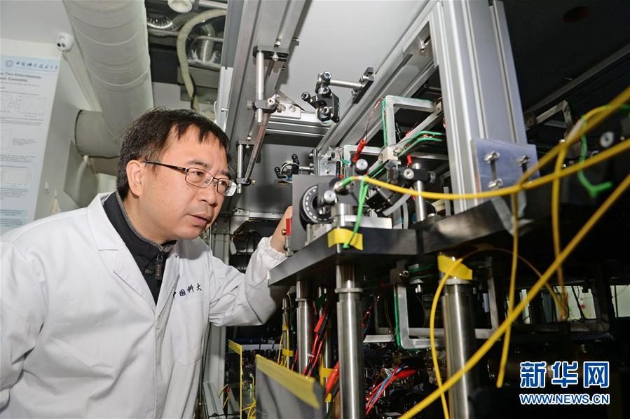 中國“墨子號(hào)”量子科學(xué)實(shí)驗(yàn)衛(wèi)星首席科學(xué)家潘建偉院士在中國科大量子存儲(chǔ)實(shí)驗(yàn)室內(nèi)了解科研情況(2017年4月20日攝)。新華社發(fā)(張大崗 攝)
