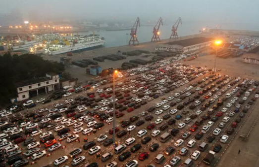 ▲ 2月22日,汽車在??谑行阌⒏鄹蹍^(qū)內(nèi)排隊(duì)等待出島。新華社記者趙穎全攝