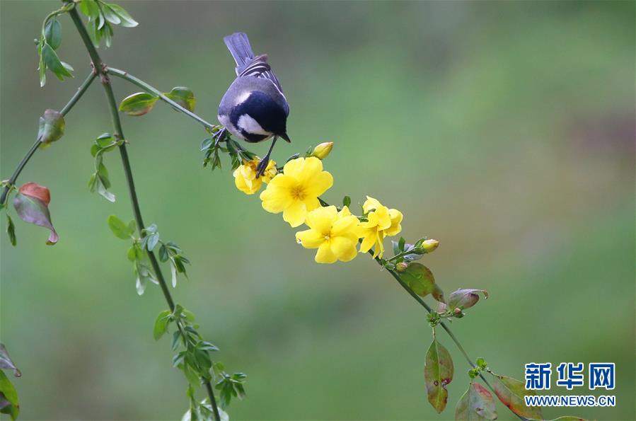 3月14日,在湖南省衡陽(yáng)市生態(tài)公園,一只小鳥停留在花枝上。新華社發(fā)(曹正平 攝)