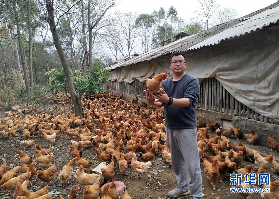 在江西省定南縣雞卿寨生態(tài)蛋雞合作社,“一村一名大學生”工程學員李良華在基地展示放養(yǎng)的生態(tài)蛋雞(3月17日攝)。新華社發(fā)