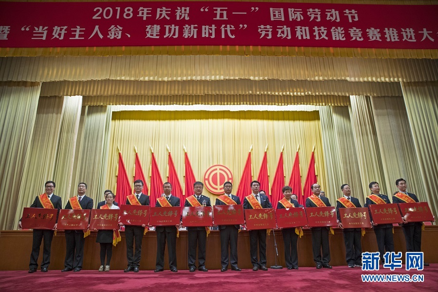 4月28日,榮獲全國(guó)工人先鋒號(hào)的部分集體代表在大會(huì)上合影。當(dāng)日,2018年慶祝“五一”國(guó)際勞動(dòng)節(jié)暨“當(dāng)好主人翁、建功新時(shí)代”勞動(dòng)和技能競(jìng)賽推進(jìn)大會(huì)在北京人民大會(huì)堂舉行。 新華社記者 才揚(yáng) 攝