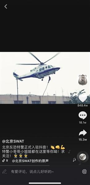 5月3日下午4點左右,陳陽通過北京市公安局反恐特警總隊的抖音賬號“北京SWAT”發(fā)布了一條37秒的視頻,搭配著當(dāng)下最熱門的“吃雞”音樂,特警隊員用各種姿勢持槍射擊,從直升機(jī)上順梯空降,步步逼近“作戰(zhàn)現(xiàn)場”。