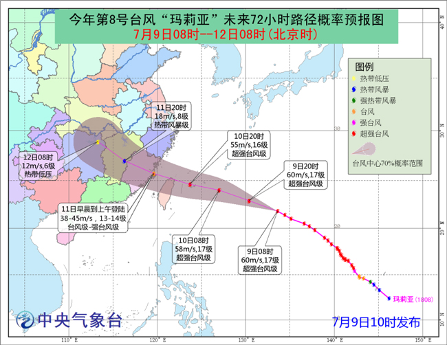 預(yù)計(jì),“瑪莉亞”將以每小時(shí)30公里左右的速度向西偏北方向移動(dòng),逐漸向臺(tái)灣以東洋面靠近,將于10日夜間登陸或擦過臺(tái)灣東北部,并于11日早晨到上午在福建晉江到浙江溫州之間沿海再次登陸(臺(tái)風(fēng)級(jí)到強(qiáng)臺(tái)風(fēng)級(jí),13-14級(jí),38-45m/s)。登陸后繼續(xù)向西北方向移動(dòng),強(qiáng)度逐漸減弱。
