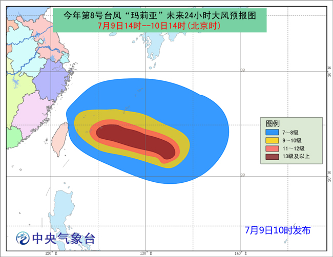 大風(fēng)預(yù)報(bào):9日14時(shí)-10日14時(shí),臺(tái)灣東北洋面和東海南部的中東部海域的風(fēng)力將逐漸加大到7-10級(jí),部分海域風(fēng)力可達(dá)11-12級(jí);琉球群島以東洋面將有9-12級(jí)大風(fēng),臺(tái)風(fēng)“瑪莉亞”中心經(jīng)過的附近洋面的風(fēng)力有13-17級(jí)。